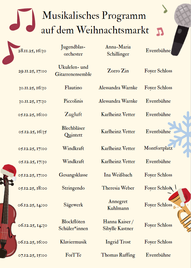 Lassen Sie sich von dem abwechslungsreichen musikalischen Programm unserer Ensembles und Orchester auf dem Tettnanger Weihnachtsmarkt verzaubern!
